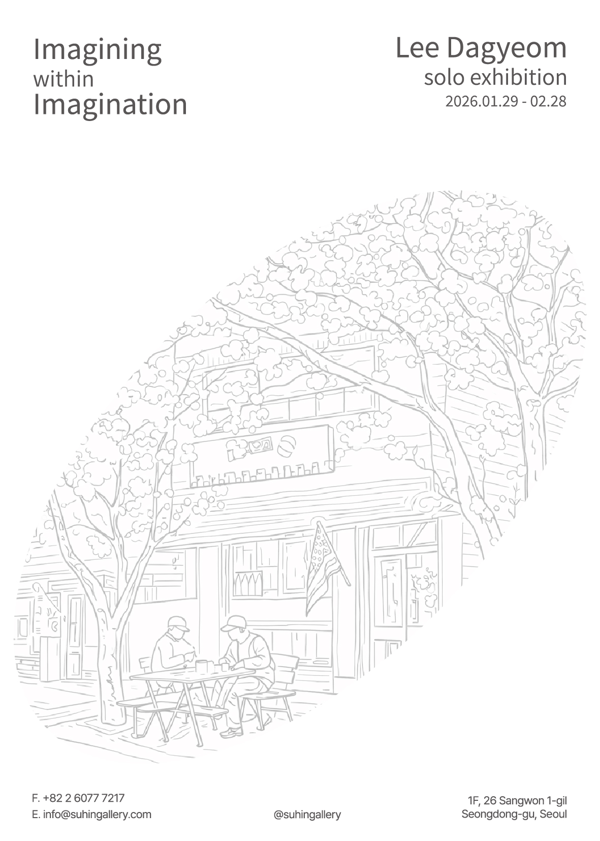 이번 전시의 제목 《상상안의 상상》은 이다겸 작가가 문학의 세계에서 길어 올린 영감을, 시각적 언어인 '선'으로 번역해낸 기록으로, 폴 오스터, 황석영, 앤디 위어, 류츠신 등 다양한 문학 작품에서 얻은 영감을 바탕으로 지어졌다. 황석영의 묵직한 서사, 앤디 위어와 류츠신이 보여준 SF적 상상력은 작가에게 시공간을 초월한 '실재감'을 부여했고, 텍스트를 통해 간접 체험한 세계가 내면에서 실재로 변하는 경험은 ‘선의 숲’으로 형상화되어 작품에 담겼다. 직접 이야기를 창조하는 것보다, 누군가의 서사속에 상상을 덧입혀 선을 긋고 쌓음으로 새로운 차원의 실재를 만들어낸다. 촘촘히 늘어선 선의 흐름 속에서 배경과 소재는 경계를 잃고 서로에게 스며든다. 이 해체된 현실의 틈을 메우는 것은 다름 아닌 감상자 각자의 몫으로 남겨진 《상상안의 상상》일 것이다. 이다겸 작가가 정성껏 마련한 이 ‘글라이드(Gliding)’적인 공간 안에서, 관객들 또한 삶의 저항을 잠시 내려놓고 유연하게 유영해 보기를 권한다.