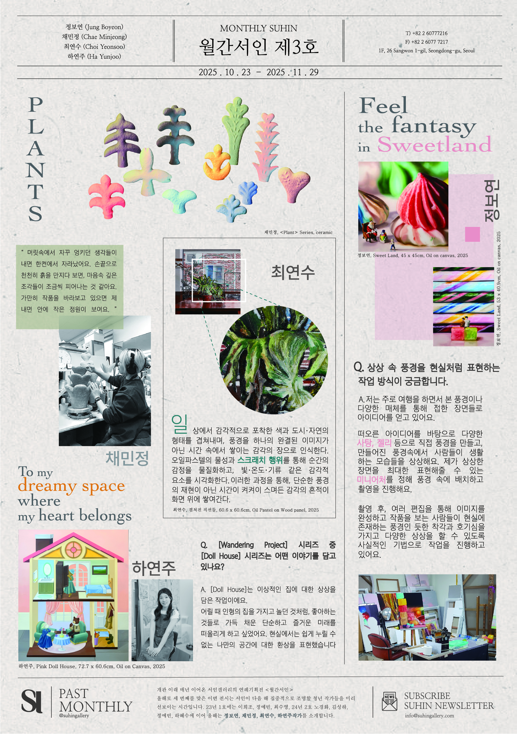 서인갤러리가 매년 개최하는 연례전시 《월간서인 제3호》는 개관 이래 매년 이어져 올해로 세 번째 이야기를 시작합니다. 월간서인은 서인갤러리가 다음 해 집중적으로 조명할 청년 작가들을 미리 선보이는 자리로, 23일부터 시작되는 이번 전시에서는 정보연, 채민정, 최연수, 하연주 작가의 작품이 30여 점 공개됩니다. 4명의 작가는 자신만의 방식으로 이미지의 확장, 물성의 실험, 상상의 층위를 깊이 있게 탐색해왔으며, 이는 유화로 세밀하게 그려낸 리얼리즘 회화, 표면의 색상이 그라데이션으로 거칠게 매만져진 세라믹, 오일파스텔 위를 니들로 긁어낸 스크라피토 기법 등으로 드러납니다. 각기 다른 매체와 감각을 통해 구축된 이들의 세계는 현실과 환상, 촉감과 시각, 사적 기억과 보편적 정서를 교차시키며, 오늘의 청년 작가들이 마주한 예술적 사유의 폭을 보여줍니다.